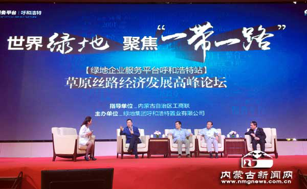 2015年6月6日,由内蒙古工商联指导、绿地集团呼和浩特置业有限公司主办的“‘世界绿地,聚焦一带一路’绿地企业服务平台呼和浩特站草原丝路经济发展高峰论坛”在呼和浩特隆重拉开序幕。论坛以“一带一路”助推合作新发展为主题,重点探讨了“一带一路”国家战略和全球经济深度融合下,为自治区乃至西北地区区域合作带来的机遇、挑战与合作创新模式等议题。